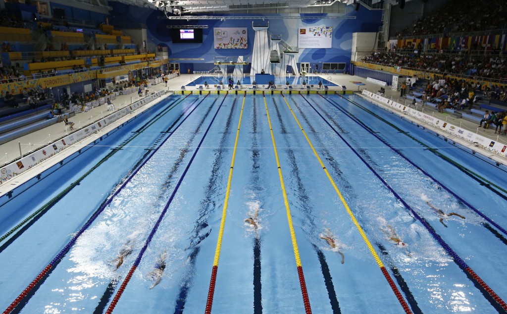 Jul 17, 2015; Toronto, Ontario, CAN; A general view during a women's swimming 400m freestyle preliminary heat during the 2015 Pan Am Games at Pan Am Aquatics UTS Centre and Field House. Mandatory Credit: Rob Schumacher-USA TODAY Sports