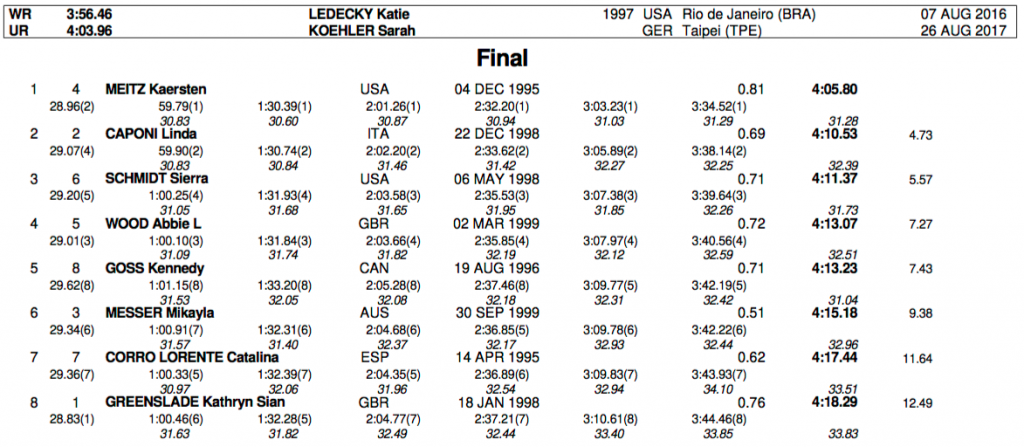 In second was Italy’s Linda Caponi with a time of 4:10.53, followed in third by the United State’s Sierra Schmidt with a time of 4:11.37.