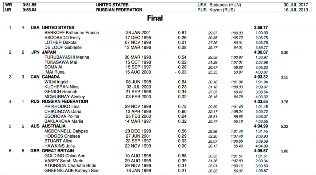 In second was Japan with swimmers Marina Furubayashi, Mai Fukasawa, Ai Soma, and Runa Imai with a time of 4:00.07.