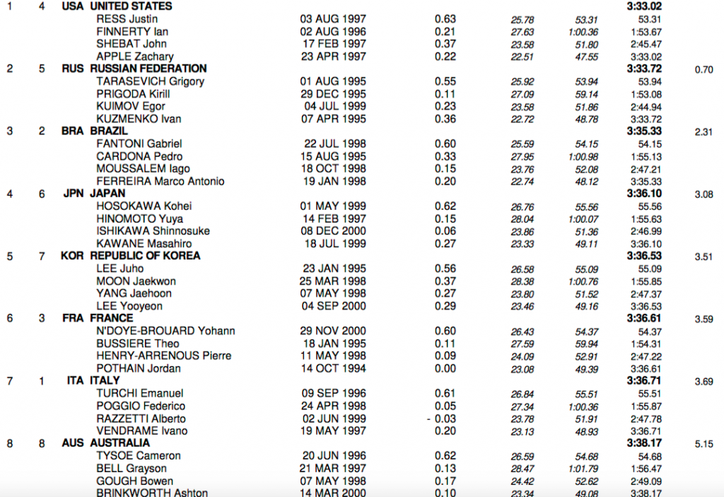 Taking the silver was the Russian Federation with swimmers Grigory Tarasevich, Kirill Prigoda, Egor Kuimov, and Ivan Kuzmenko with a time of 3:33.72.
