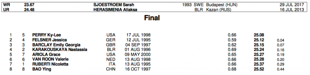 Coming in second was Germany’s Jessica Felsner with a time of 25.12, followed in third by Great Britain’s Emily Georgia Barclay with a time of 25.15.