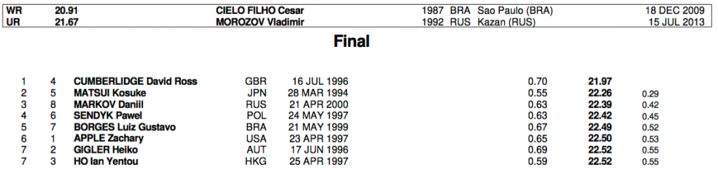 In fourth was Poland’s Pawel Sendyk (22.42), in fifth was Brazil’s Luiz Gustavo Borges (22.49), in sixth was the United State’s Zachary Apple (22.50), in a tie for seventh was Austria’s Heiko Gigler and Hong Kong’s Ian Yentou Ho with a time of 22.52.