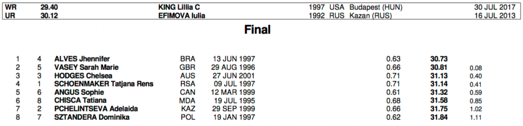 In fourth was South Africa’s Tatjana Rens Schoenmaker (31.14), in fifth was Canada’s Sophie Angus (31.32), in sixth was Moldova’s Tatiana Chisca (31.58), in seventh was Kazakhstan’s Adelaida Pchelintseva (31.75), and in eighth was Poland’s Dominika Sztandera (31.84).