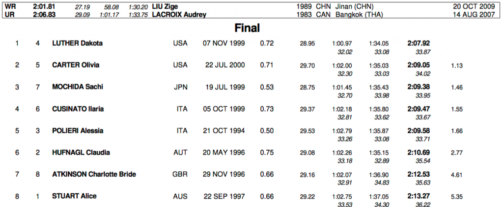 Coming in second was the United State’s Olivia Carter with a time of 2:09.05, followed in third by Japan’s Sachi Mochida with a time of 2:09.38.