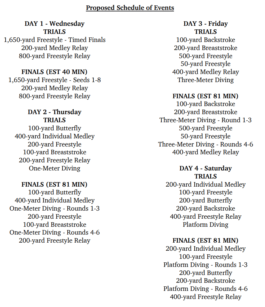 The full schedule, as posted in a report of the NCAA Swimming and Diving Oversight Committee videoconference from Sept. 25, is available here.
