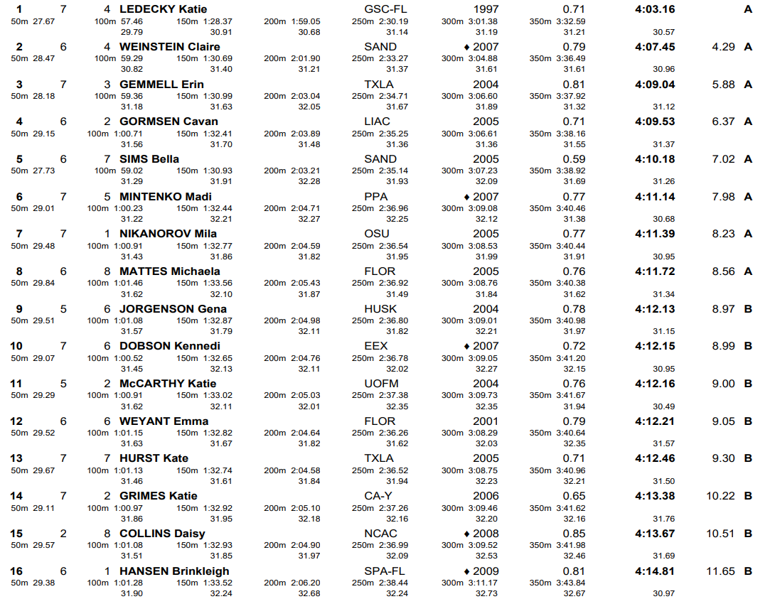 Second in the heats went to Claire Weinstein in 4:07.45. Weinstein is already on the team after winning the 200 free and coming from behind to take second in the 800, and her Fort Lauderdale time of 4:01.26 put her at No. 4 in the world standings. The only other swimmers to crack 4:10 were Erin Gemmell (4:09.04) and Cavan Gormsen (4:09.53), with 2023 World Championship finalist Bella Sims in fifth place at 4:10.18.