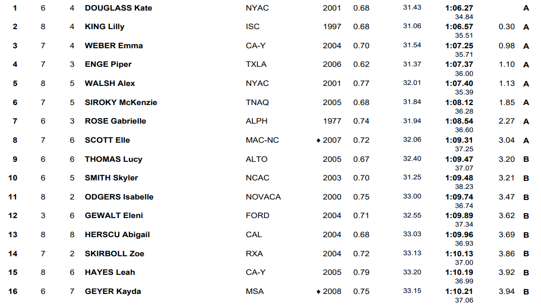 Douglass was joined in 1:06 territory in the morning by Lilly King, the world-record holder and 2016 Olympic champion competing in her final qualification meet prior to retirement. King won the 50 breast Thursday, and she will be in lane five in the final after clocking 1:06.57 for the second spot. On the other side of Douglass will be a pair of her University of Virginia teammates, Emma Weber (1:07.25) and Alex Walsh (1:07.40). Walsh was the runnerup to Douglass in the 200 breast Wednesday while Weber finished to second to King in the 100 breast at last year’s Olympic Trials.
