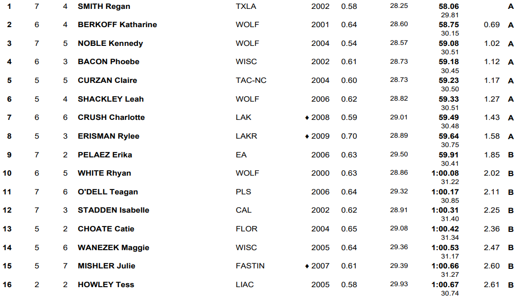 Erika Pelaez finished out of the mix despite going 59.91 in the morning, and also relegated to the consolation heat were Tokyo Olympic finalist Rhyan White (1:00.08), Teagan O’Dell (1:00.17) and Isabelle Stadden (1:00.31).