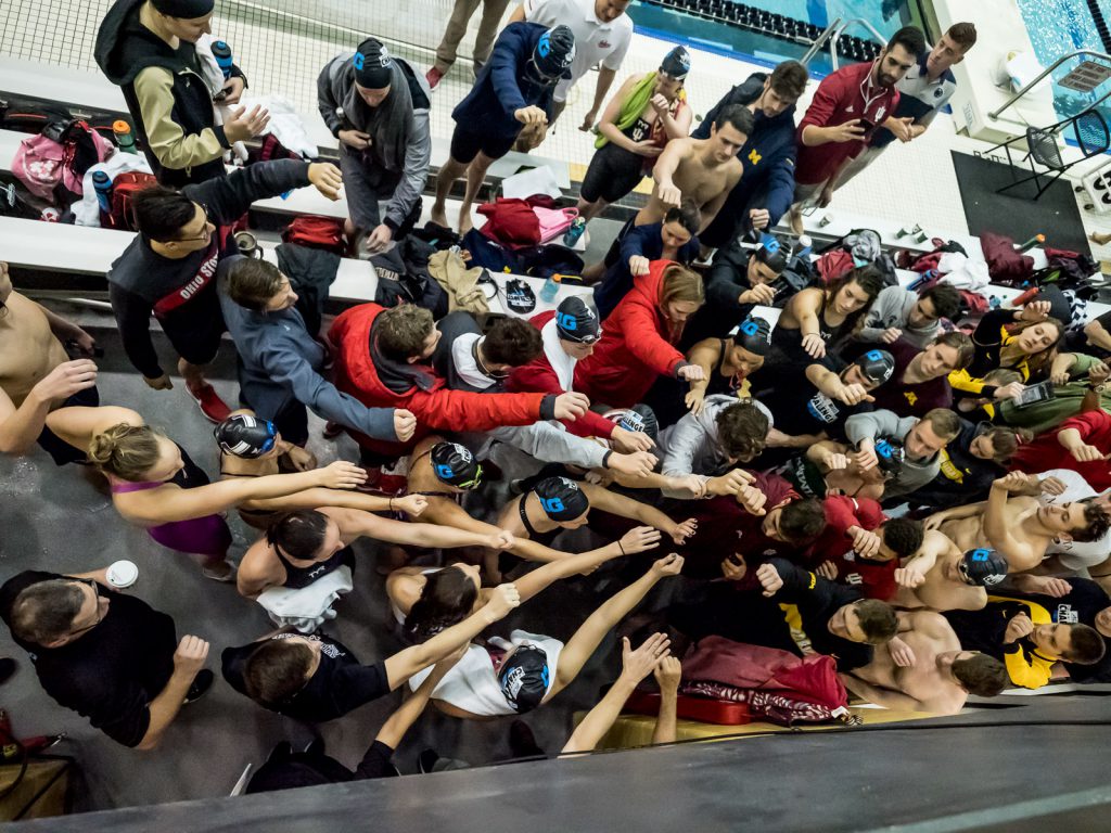 As the men stepped up for the 500 free after commercial break, the natatorium hushed. Two men were seeded to dominate the race, Marcela Acosta from the ACC and Felix Auboeck from the Big Ten, placed side-by-side in lanes four and five, respectively. Seeing as it was the last individual event before a 45 minute break, both teams filtered out of the warm down pool and lined the sides of the competition pool.