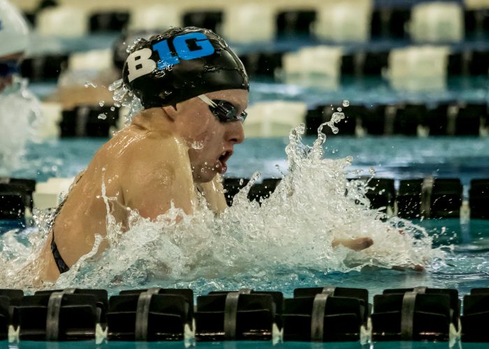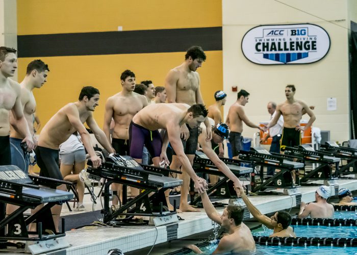 Coming off a mixed conference dinner in the banquet room above the Purdue football field Friday night, the ACC and Big Ten retreated back to their corners. The black-cap clad Big Ten took the first four lanes of the warm-up pool as the ACC entered the natatorium with a boisterous team cheer, leaving the laughs and light conversation in hindsight. A white water warm-up ensued, where meticulous and unfamiliar relay exchanges left the crowd nervous and excited.