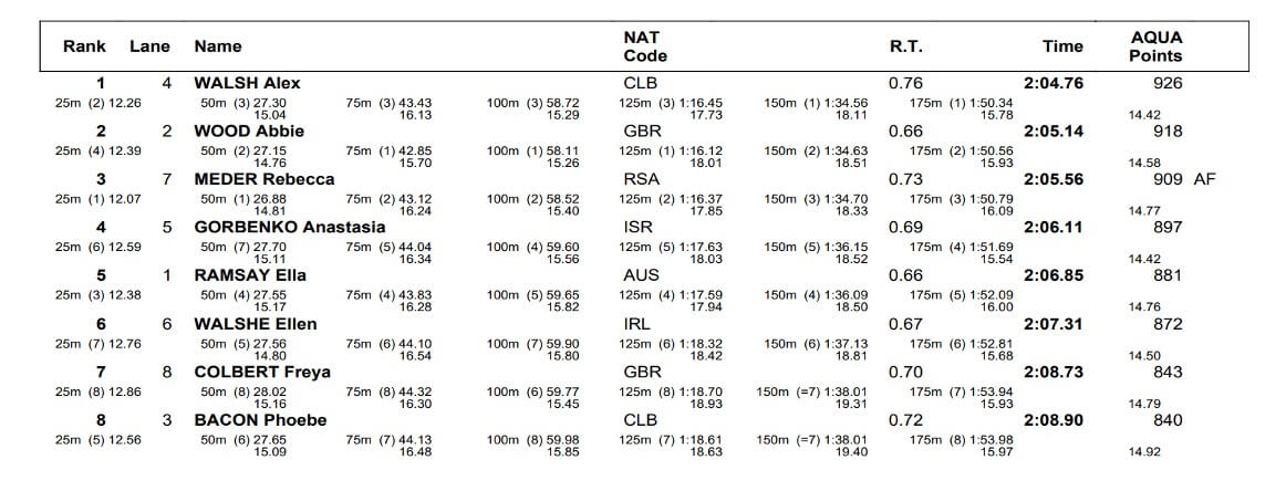 A little more than an hour after her sister won the 100 butterfly, Alex Walsh capped the Carmel stop of the World Cup series by topping the field in the 200 individual medley. Walsh battled Great Britain’s Abbie Wood and South African Rebecca Meder to the finish, but the American emerged victorious in 2:04.76. Wood, the winner of the 400 IM on Saturday night, won the silver medal in 2:05.14, with Meder going an African record of 2:05.56.