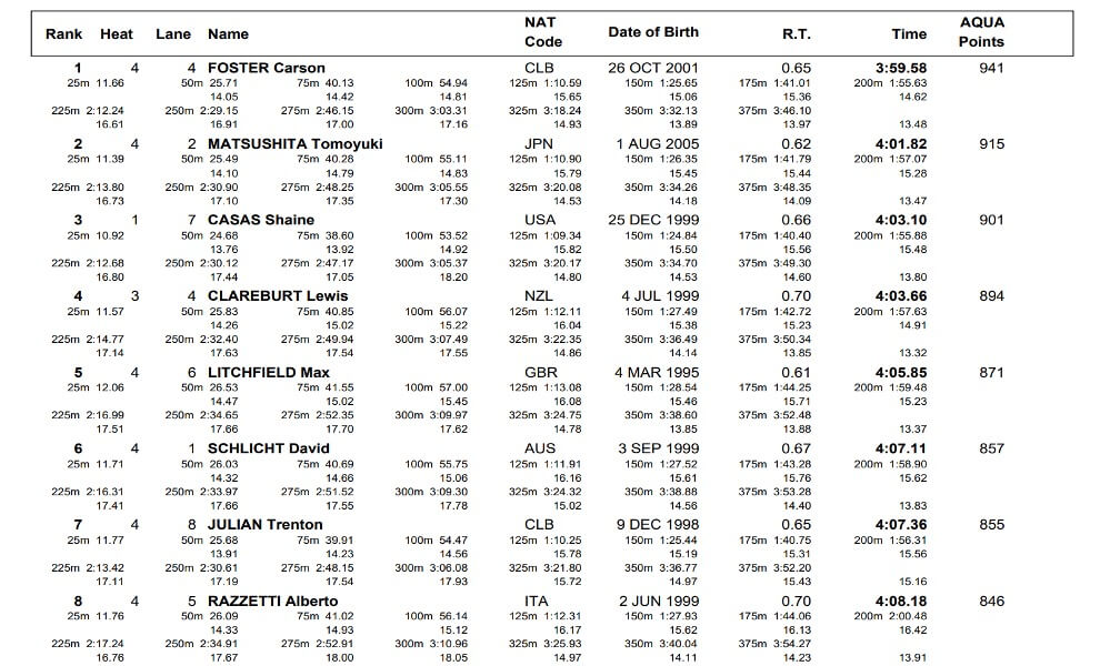 The United States’ Carson Foster was the only athlete to crack the four-minute barrier, going 3:59.58 to earn a victory over Japan’s Tomoyuki Matsushita, the silver medalist at the 2024 Olympic Games and 2025 World Championships. Foster led Matsushita by just .17 after the opening butterfly leg, but his margin expanded to 1.44 seconds by the midway point of the race. Matsushita notched a time of 4:01.82.